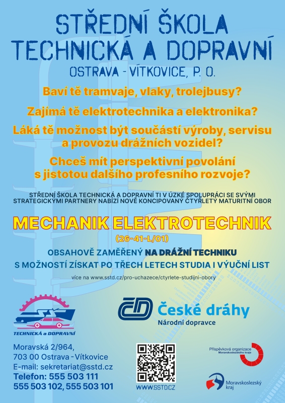 Střední škola technická a dopravní v Ostravě, která je jednou z našich partnerských škol, otevírá s novým školním rokem pro žáky další zajímavý obor. Nový obor Mechanik elektrotechnik bude zaměřený na elektronické systémy a elektrické trakční zařízení drážních vozidel. Absolventi oboru mohou získat jak výuční list, tak maturitní vzdělání a uplatnění naleznou především v oblasti údržby a obsluhy elektrických trakčních zařízení, elektronických a elektrických systémů či mechanických celků drážních vozidel.