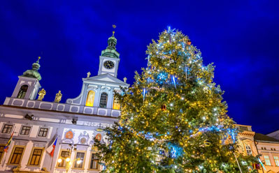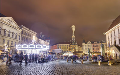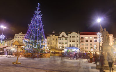 Vánoční trhy najdete na hlavním náměstí s barokní architekturou. V přistavěných stáncích